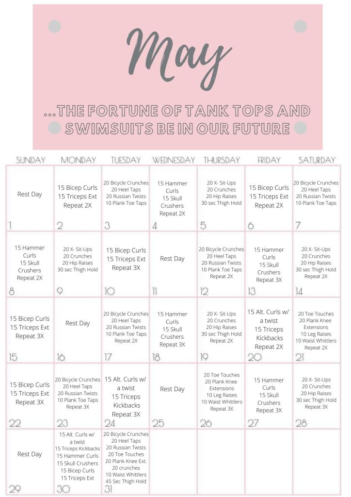 Here is your MAY workout challenge. A little bit of bi’s, tri’s, and abs (as asked)!